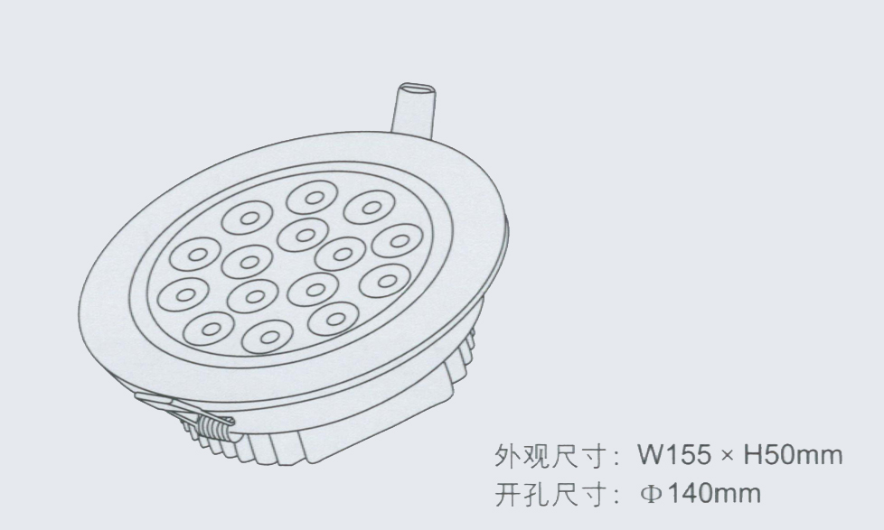 产品型号 输入电压 LED功率 LED数量 光通量 外观尺寸 开孔尺寸
