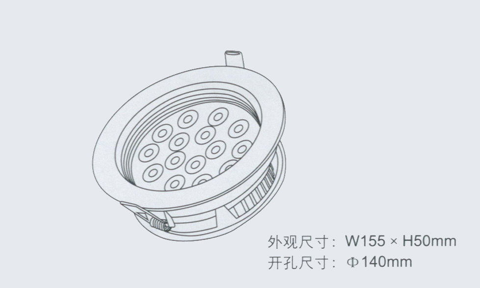 产品型号 输入电压 LED功率 LED数量 光通量 外观尺寸 开孔尺寸