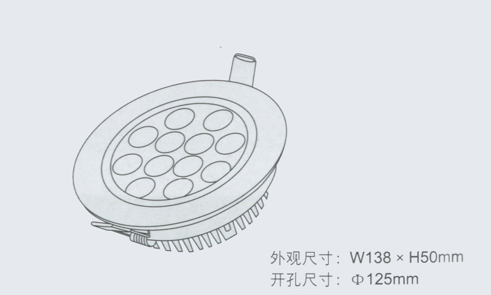 产品型号 输入电压 LED功率 LED数量 光通量 外观尺寸 开孔尺寸