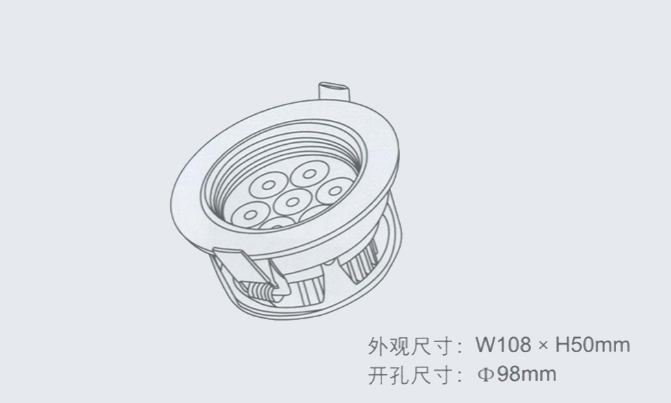 光源类型:大功率LED 色温:3000K/6000K 环境温度:-20℃-+40℃ 灯具温度:≤50℃ 功率因数:≥0.5 显色指数:≥80(3000K),≥70(6000K) 材质:铝+PC透镜 表面颜色:高光金