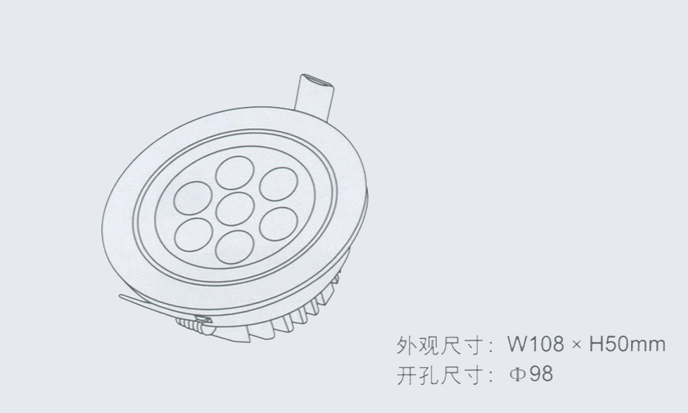 产品型号 输入电压 LED功率 LED数量 光通量 外观尺寸 开孔尺寸