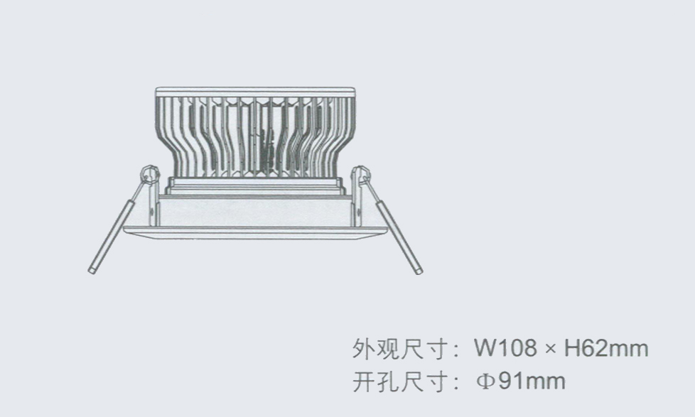 产品型号 输入电压 LED功率 LED数量 光通量 外观尺寸 开孔尺寸