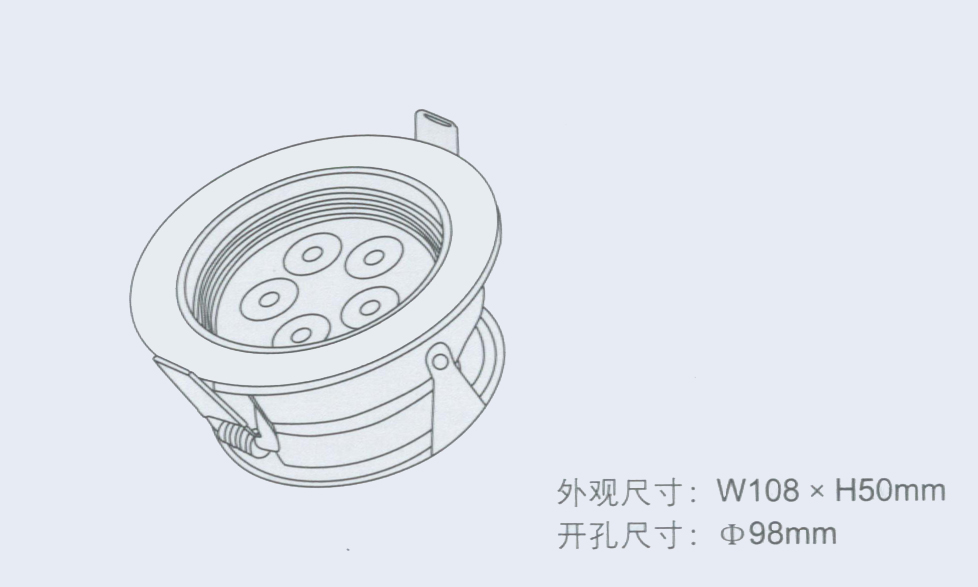 产品型号 输入电压 LED功率 LED数量 光通量 外观尺寸 开孔尺寸
