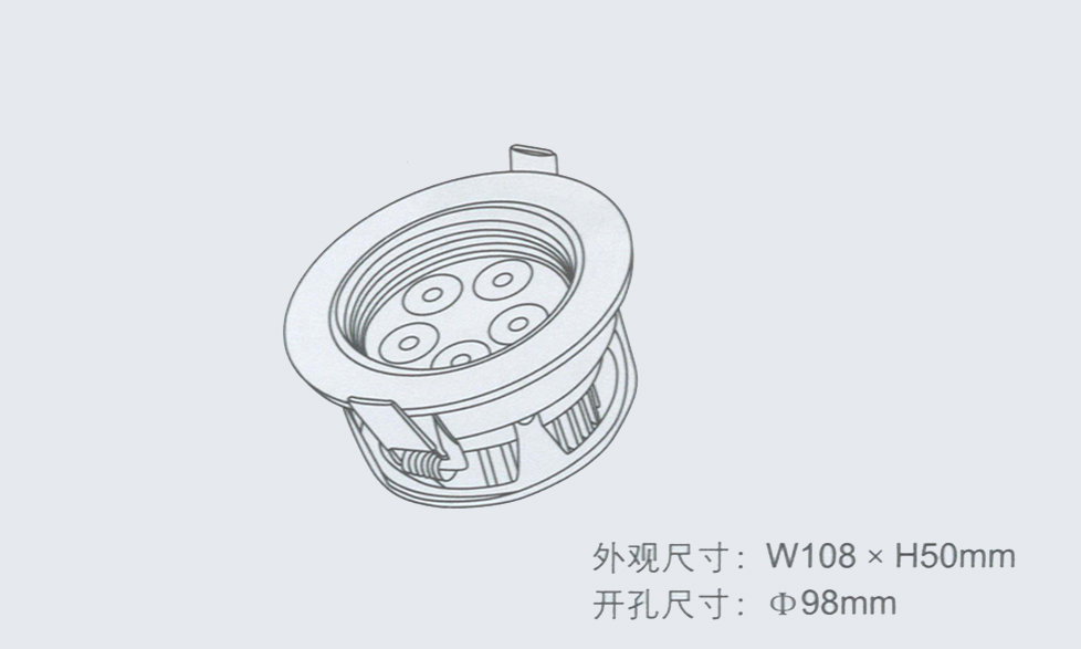 产品型号 输入电压 LED功率 LED数量 光通量 外观尺寸 开孔尺寸